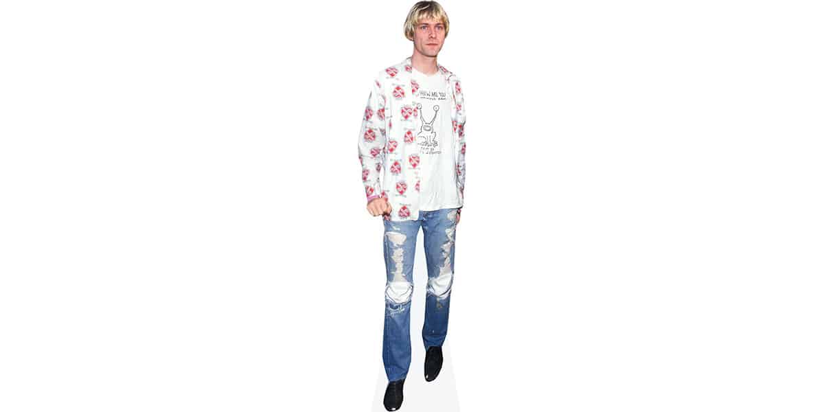 If you’re after something more compact, the mini version of Kurt Cobain (Jeans) Cardboard Cutout measures around 60cm tall by 21cm wide (2' x 8"). All our cutouts arrive freestanding, complete with a sturdy fold-out stand on the back — simple to display, easy to move.